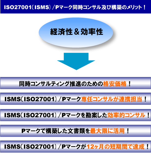 ・コンサルティング期間 12ヶ月 ◆プライバシーマーク(Pマーク)専任コンサルタント 1名 ◆ISO27001(ISMS)専任コンサルタント 1名 ・ISO27001(ISMS)+プライバシーマーク (Pマーク)の統合スケジュール提供 ※本コースの詳細についてのご説明は、いつでもお伺いさせて頂きます。
